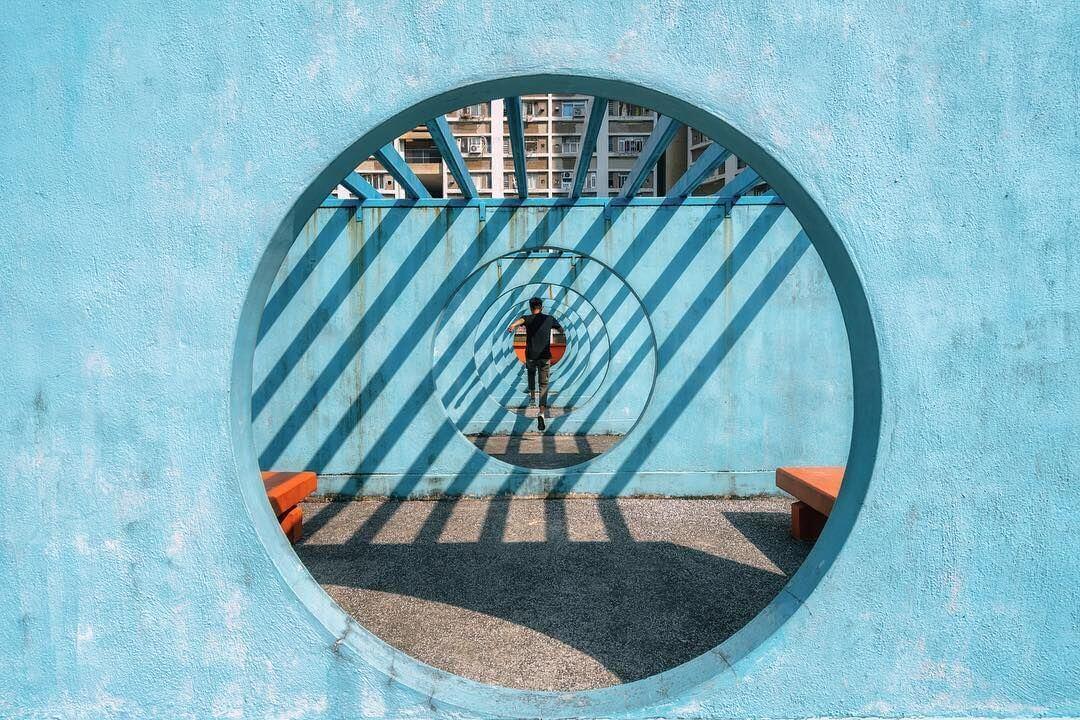 Bức ảnh “siêu thực” này được chụp từ nóc bãi đậu xe của khu chung cư này. Những vòng tròn nối tiếp nhau, sơn màu xanh pastel. Khung cảnh càng nghệ thuật khi mặt trời lên in bóng của những thanh ngang phía trên, tạo nên hình ảnh rất nghệ thuật.